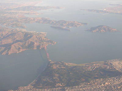 下图是在飞往 San Francisco 上空拍的,有看到红色的旧金山大桥喔!