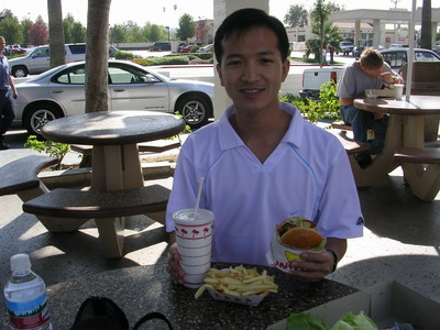 一個多小時後飛到 LA, 表妹開車接我到她家稍作休息之後, 我和表妹和二阿姨三人便驅車直接前往 Palm Spring(棕櫚泉),開了一陣子時間接近 11:15, 經過一家 In & Out 漢堡店, 已經排了很多車在等了。 我馬上叫表妹開過去點餐。 來美國之前一位住過 LA 的同學強力推薦我吃這一家的漢堡, 既然讓我遇上了當然要嚐一嚐。 Menu 非常簡單, 就只有 Hamburger & Cheese burger 兩種而已,點完菜等了快 20 分鐘才去櫃台領取餐點, 現作的漢堡果然很新鮮, 吃起來口感十足, 漢堡皮有點烤焦, 吃起來像是頂級版的漢堡王, 連薯條也特別地好吃。