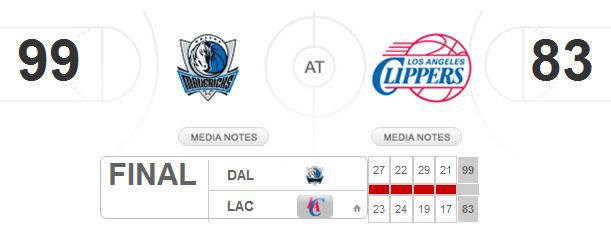 在比賽過程上,Clippers 第一節打超爛,傳球不到位,外線砍不進 簡直跟 Mavericks 不是同一個等級的球隊。好不容易打到第二節由D.Jordan 的一個灌籃讓觀眾情緒 High 起來,之後便在加油聲中逆轉,追平比數甚至超前。沒想到中場前 0.5 秒被 Kidd 在另一邊的三分線內就出手,砍進超級大號三分球,變成落後兩分。第三節比數又被 Mavericks 拉開,從此大勢底定,Mavericks 主將Nowitzki 也樂得在場邊幫隊友加油,到第四節最後才上場保住勝果。