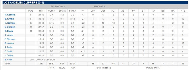 Clippers 感覺全隊默契欠佳,傳球不是不順就是被抄截,不然就是隊友漏接,再加上今天得分後衛 Gordon 外線失準,三分球 6 投 1 中,想追分都很難。唯一的收穫就是看到去年的狀元 Griffin ,身材很壯碩,和 Kaman 分別貢獻 16 和 13 分。