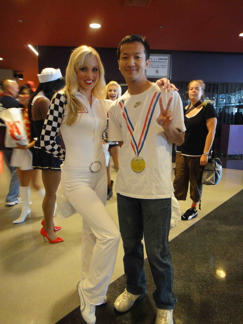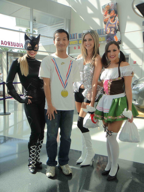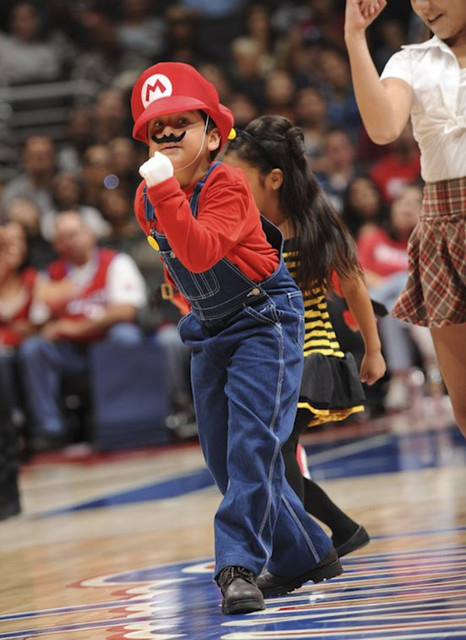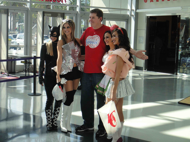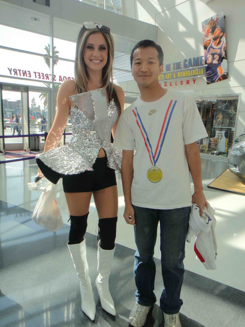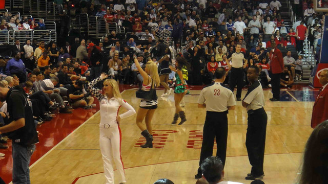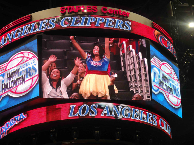 一入場就看到有穿 Halloween costume 的工作人員在發放糖果, 我跑過去問她們說哪邊可以看到 LA Clippers 啦啦隊,結果她說: “Actually we are LA Clippers cheerleaders……”,因為是萬聖節的緣故,所以在今天的比賽只會穿這套衣服亮相, 平常的比賽才會穿原本的啦啦隊制服,還趁機幫球隊打廣告,請我一定要記得再回去看他們的比賽。