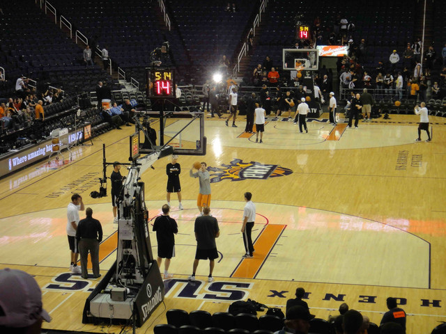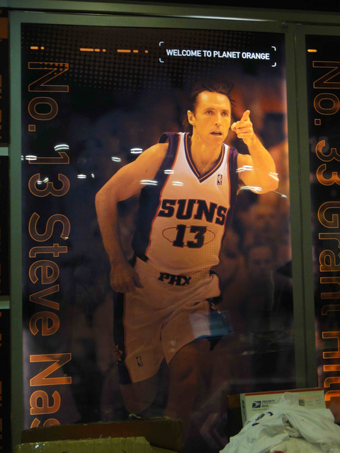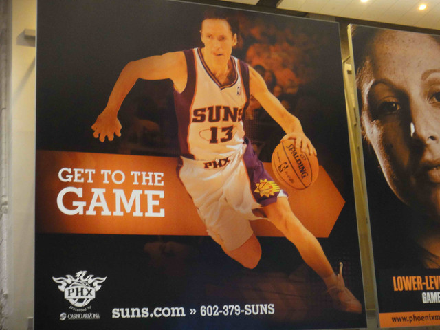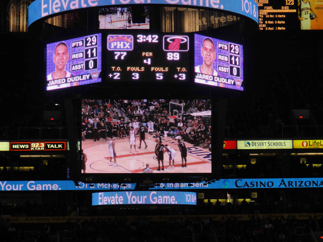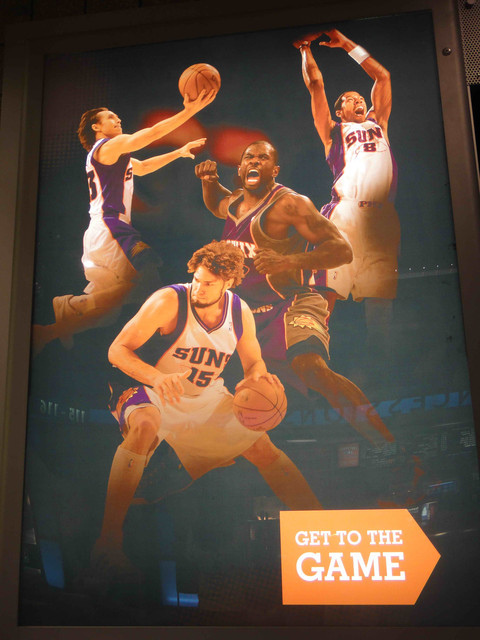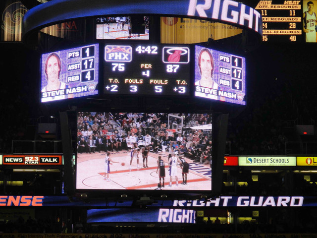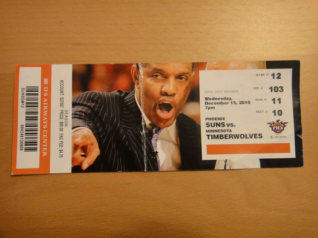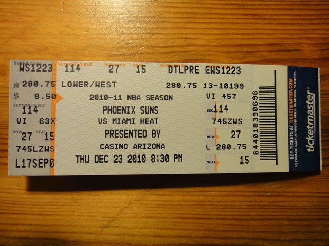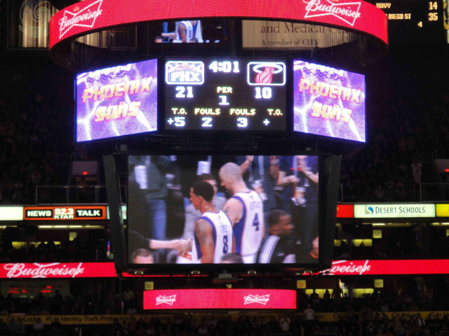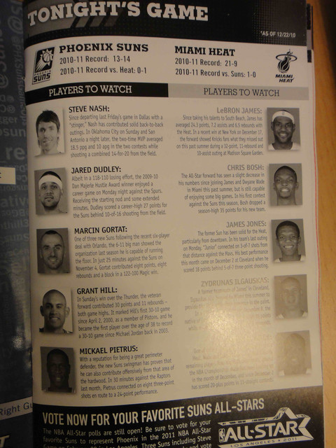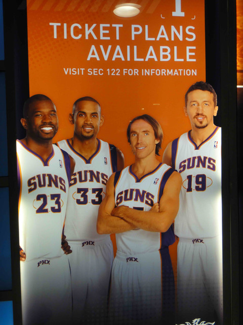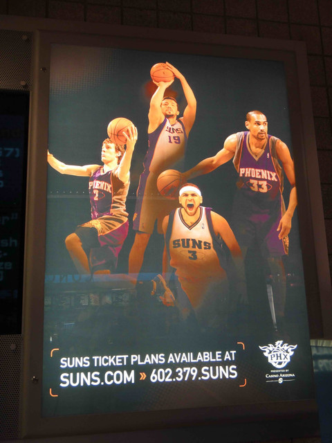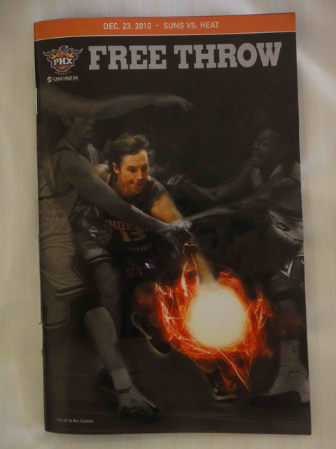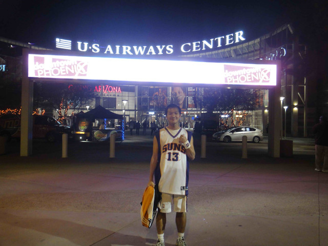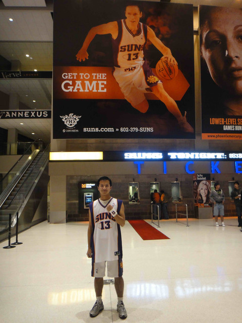 繼 2005 年從台灣飛到鳳凰城後,終於又有機會回到太陽隊主場看球。可惜我的整個 winter break 期間,主場比賽只有這一場,所以也沒得選,偏偏遇到票價超高的對決熱火隊比賽。這是 Suns 在跟魔術隊交易之後的第一場比賽,也趁機看看新來的球員,還有體驗一下聖誕節前夕的比賽氣氛。 (這一次是住在 Wyndham飯店,就在第一次來 Phoenix 住的 Hyatt 飯店對面,走路 5 分鐘即可到球場)