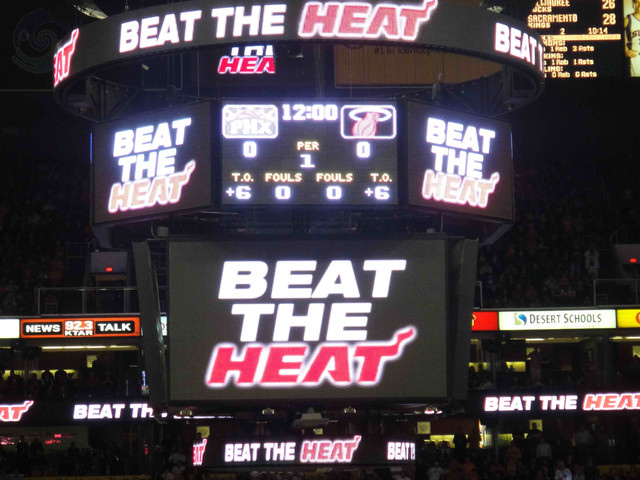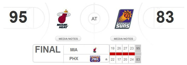 第四節幾度追到個位數的落後分數都被 Heat 又拉開,終場太陽就以 83:95 敗下陣來,我身上背負的主場魔咒持續發功,兩度到主場看球,太陽隊分別輸給小牛和熱火;兩度到 staple center 看球,太陽都擊敗湖人隊;外加一次去 staple center 看球,快艇輸給小牛隊。