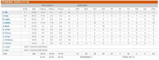 小前鋒Dudley接下了 Richarson 留下來的先發得分後衛重任,似乎沒有適應不良的問題,反而在改任先發之後,今晚整個得分和籃板大爆發,搶下 12 個籃板和三分線 10 投 7 中,轟下 33 分! (上一場對馬刺才剛創下生涯新高 27 分)