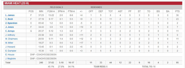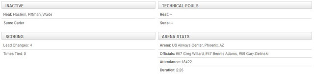 第一節有 2/3 的時間讓我看得很 High,雖然 Wade 缺陣,但是可以領先 11 分真的出乎我意料之外。可惜 Nash 下場後,在Dragic 的指揮下Suns一度找不到進攻節奏,自此之後就被 Heat 慢慢追上來,甚至超前拉開比數,一直到最後都追不回來。每次只要分數被追進,James 馬上又把分數拉開。雖然 James 還是得了 36 分,可是最老也是最好的防守大鎖 Hill 已經盡力了,只差一次犯規就可以讓 James下場。另外,我想也是防守 James 消耗掉太多 Hill 的體力,今天的中距離命中率不佳。