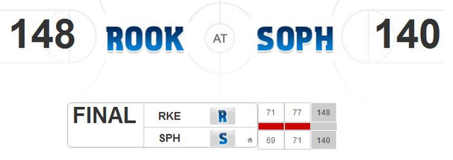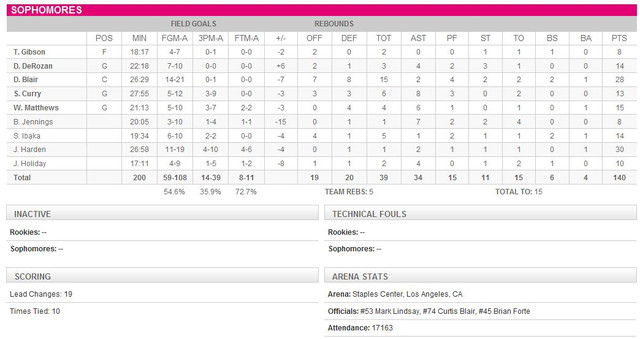 比賽幾乎都是 Rookie team 處於領先的狀態,一路打到下半場剩 7:20 秒時,Curry 的三分彈幫助學長們逆轉分數,可惜馬上又被拉開,最後剩 30 秒時又是 Curry 的三分球追到差 4 分,可惜最後還是以 140 : 148 輸球。去年打敗學長的 Rookie team 在今年變成苦主,長江後浪推前浪,Sophomore team 連續兩年吞敗。