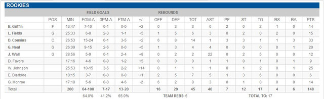 John Wall 比賽前就告訴 Cousins 說自己打算打破 Chris Paul 17 助攻的記錄,果然如願以償,還以 12 分外加 22 助攻拿下 MVP,這種比賽果然是刷數據的好機會啊! 終場前他也秀了灌籃,博得全場的歡呼!