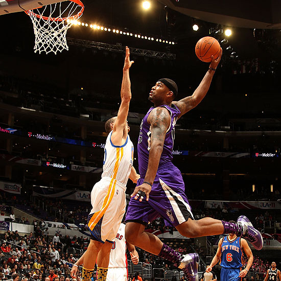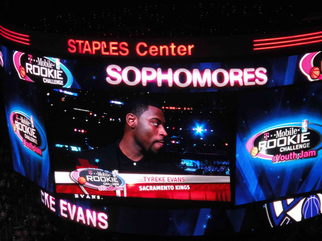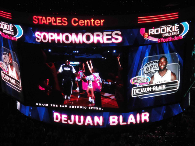 開賽沒多久 Rookie team 就取得領先,全場幾乎不設防的比賽就是兩邊拼命打快攻,一有機會就灌籃,Rookie team 轟炸籃框最多的就是 Cousins,全場拿下 33 分外加 14 籃板,地主英雄 Griffin 受限於要連打三天明星賽,所以只上場 13 分鐘, 意思意思拿個14 分和 3 籃板,不然我想他應該會灌得更過癮。Sophomore team 的 Blair 身材超壯碩的,也是有機會就灌籃,還有一球快攻自己丟球打板後灌籃,讓球場歡呼不斷。
