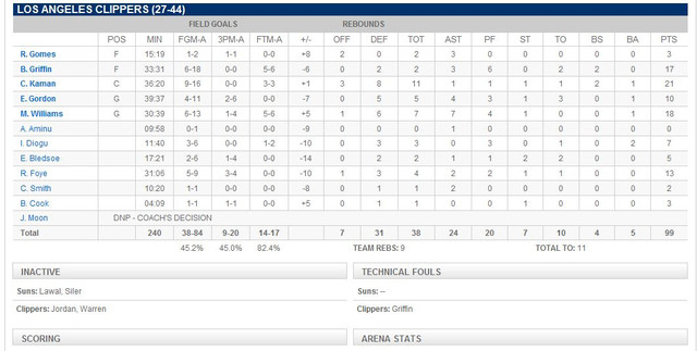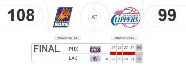 進入第四節時,Suns只有 81:78 領先三分,Clippers 一度 8 投不中,比分變成 89: 78,然後終場前 4 分多鐘時,Suns 持續領先到 97:84,結果Griffin 一個力壓 Gortat的灌籃被判進攻犯規,更糟的是犯滿畢業。這就成了整場比賽的 turning point,雖然 Clippers 其他的球員還是繼續追分,但整個氣勢已經大不如前,最終 Clippers就以 99: 108 輸球。