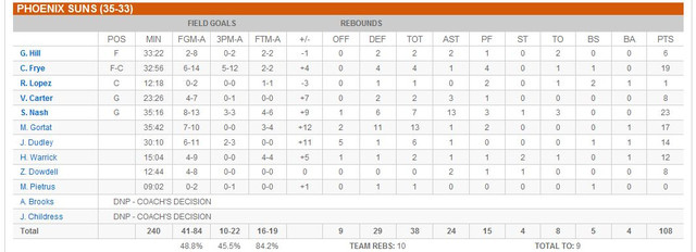 Nash 這一場在 VC 和 Hill 表現不佳的情形下挺身而出,攻下23分 13 籃板和 7 助攻,尤其是 3 投 3 中的三分線,屢次在關鍵時刻發揮功用,抵擋住對方追分的攻勢。雖然是傷癒歸隊的第二場比賽,不過整個 Suns 就是圍繞著他在運轉,有他的組織進攻和傳球,真的讓團隊進攻整個提升到另一個檔次。