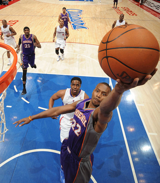 Frye 從 3/6 右肩脫臼受傷,才休息 12 天就歸隊,又是防守 Griffin,讓人捏一把冷汗,還好手感沒有太大影響,前幾次三分出手都沒進,絲毫不影響他的信心,總計三分球 12 投 5 中,尤其是終場前 52 秒的三分球把分數拉開到 107:97 的兩位數差距,幫助 Suns穩穩拿下這一場比賽的勝利。(圖片中可以看到 Frye 還是載著護具上場)