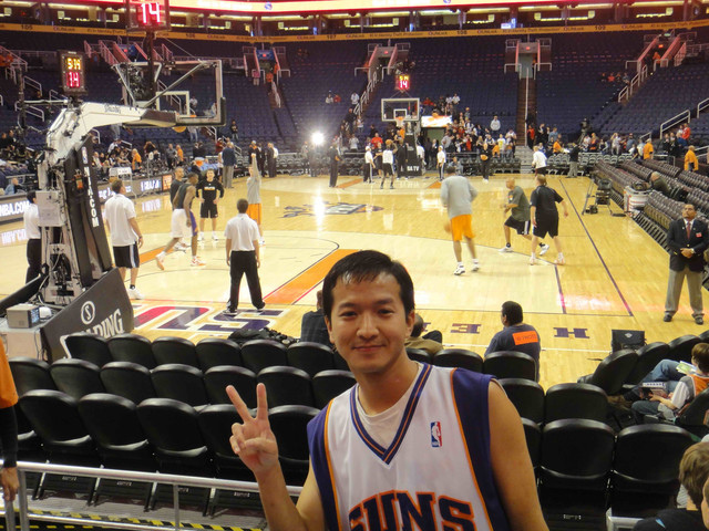和 Suns 球迷合影,我跟他說我最喜歡的太陽球員就是他身上所穿背心的 Kevin Johnson,他很熱情地問我要不要把背心套在我身上拍照