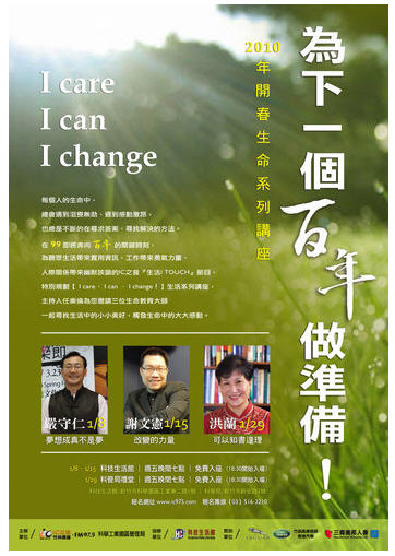 1/29 在竹科管理局聽了由 IC 之音主辦的【I care,I can,I change!】生活系列講座:洪蘭教授的「可以知書達理」演講,在這裡把精彩內容記錄下來分享給當晚錯過的朋友們。其實部份內容和 2008年她到公司的演講有點重複,不過還是聽得很高興,同樣的笑話也聽不膩。因為教授永遠是那麼熱情和幽默;永遠是那麼想要用飛快的講話速度,在有限的時間內帶給聽眾最多的知識,希望可以替台灣的孩童教育盡一份心力。