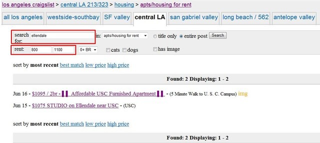 search for 的地方可以直接輸入街道名,然後 rent 輸入可以接受的 price range,就可以查詢到符合條件的房子,而且可以看 google map,順便利用 search by 功能看房子離 USC 多遠。