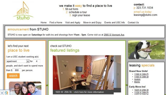 找 USC 附近的房子也找了兩天,在這邊分享一些自己的小小心得。聽完 USC new student sendoff 活動上的學長介紹 housing心得之後,便鎖定較多學生居住的學校北邊、東北邊和西邊為目標區域。然後先在網路搜尋預算範圍之內的房子,等人到 USC 之後再開始親自參訪視察。以下的介紹是以 off-campus 為主,我因為要先念語言學校,所以必須找可以在 6/28 之前 available 的房子,接著就一口氣住到隔年畢業為止,不想搬兩次家。如果是 8 月正式開學之前才要找房子的人,可以先租一些暑期短期住宿的房子,房租通常比較便宜,而且一般房子都是 8/1 才可以入住,所以還有充分時間可以慢慢看。下面是幾個很實用的找房子網站: