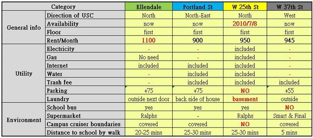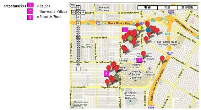 以下是我問過 10 幾家房子後整理出來的最後 4 家的調查表和地圖標示(四個圓點分別對應 Excel表格中四個房子的位置,綠色、藍色、黃色、灰色分別代表 Ellendale, Portland St, W 25th St, W 37th St),最後我是選擇W 37th St。原因是:1) 房間佈置和擺設我比較喜歡 2) 離學校超近 3) 附近有超市(雖然比 Ralphs & University Village超市來得小 4) 可以馬上入住 5) 房東為華人,超好溝通