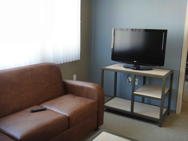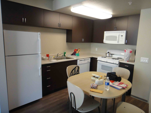 簽約一年的話一個月 899 USD,已經包括水、電、瓦斯、網路費,所有的家具都不用再買,客廳內還有 37” LCD TV 和一堆頻道可以觀賞,然後大樓入口處有警衛,還有專人管理和協助收取信件和包裹。好處是從學校穿過馬路就到家了,不用擔心走路途中的安全問題;而且不會因為錯過郵差遞送包裹而必須找時間去郵局領取。