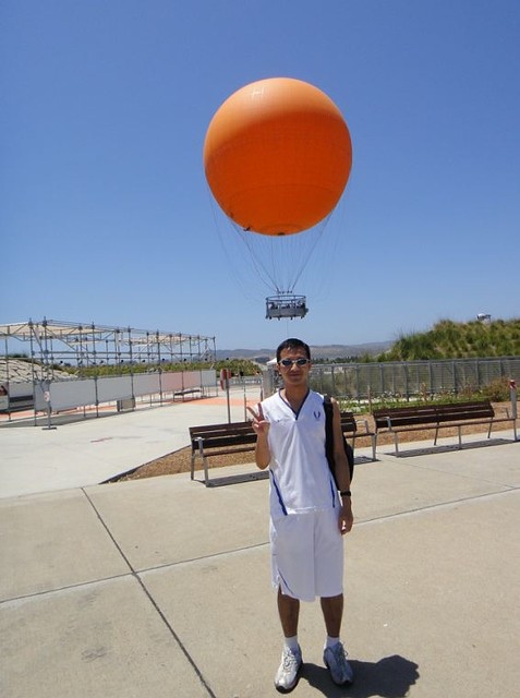6/20 有睡飽 8 小時果然精神比較好,而且時差有稍微調回來一點。早上先去 Orange County Great Park 體驗免費的熱氣球。這邊原本是二次世界大戰時的軍事基地,現在變成軍方和政府合作建造的公園,要到2012 年才會全部完工,不過目前有提供熱氣球的遊樂設施。在 2005 年一個人來美國到 phoenix city 時本來也有預約熱氣球觀光行程,結果早上5:00 到升空地點時,因為沒有風只好取消活動。而這一次要搭的熱氣球是綁上鋼索的,只能垂直升降,一次 10 分鐘,不過至少是免費的,對於經濟拮据的留學生來說是再好不過的選擇了!