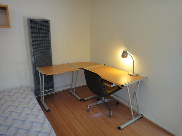 呼~ 找了兩天,終於找到未來一年的新家了。不過下圖中的電腦桌和立燈等到簽約後,房東才說那個是展示用,之後會撤走,換一個較舊的書桌,有一種上當的感覺。但是我沒錢可以買車,這邊離學校超近,所以對我來說很方便。房間比新竹金山街套房稍大一點,月租要 945 USD 一個月,還不含水、電、瓦斯、網路費,通通計算進去,都超過 33,000 NTD 了,又是來搶錢的。這邊還是算中價位而已,還有一個月 1600 ~ 2000 USD 以上的,是租金不是房貸喔!