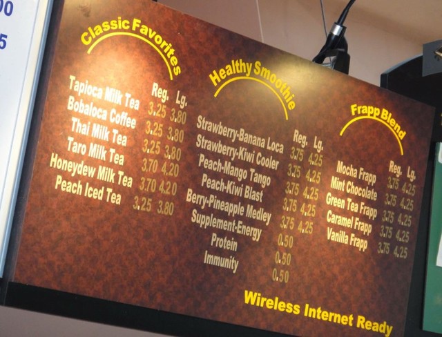 「珍珠奶茶」在美國怎麼說? 請看下圖 menu左上角第一個商品名:「Tapioca Milk Tea」。Tapioca是木薯粉的意思,就是作麵包和粉圓的材料,也是夭壽貴的啦! 而且沒有台灣好喝。又開始懷念新竹金山街放眼過去,有四五家手搖飲料店可以挑的場景了。