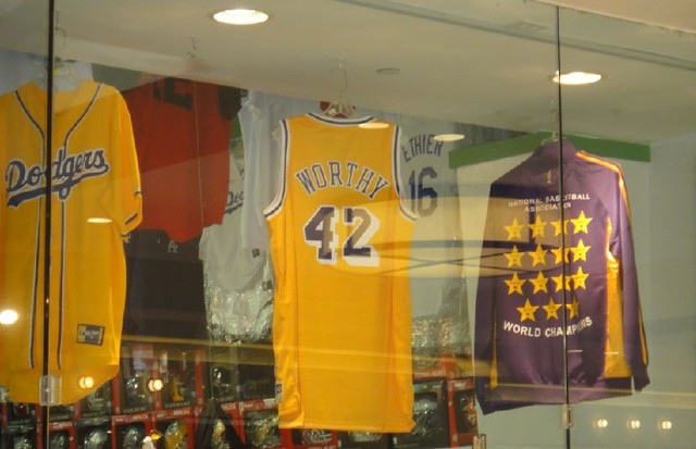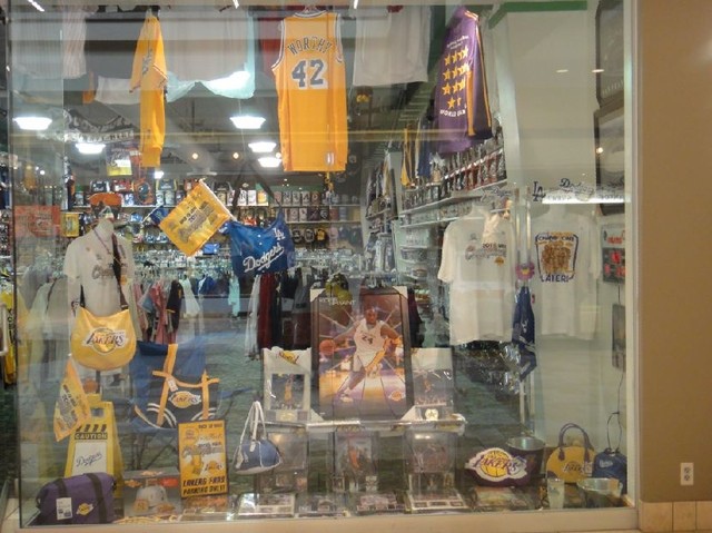 也去逛了幾家體育用品店,包括 Fool Locker 等商店。最新的 Kobe 5 球鞋不含稅 130 USD,比台灣還貴。還有一整面可愛的 Nike 籃球鞋 for Baby,也有 Kobe 5款式。我發現穿 Phoenix Suns 太陽隊T-shirt 來這邊晃都會感受到老闆不友善的眼光,尤其是整家店都賣 Lakers 湖人隊商品時。