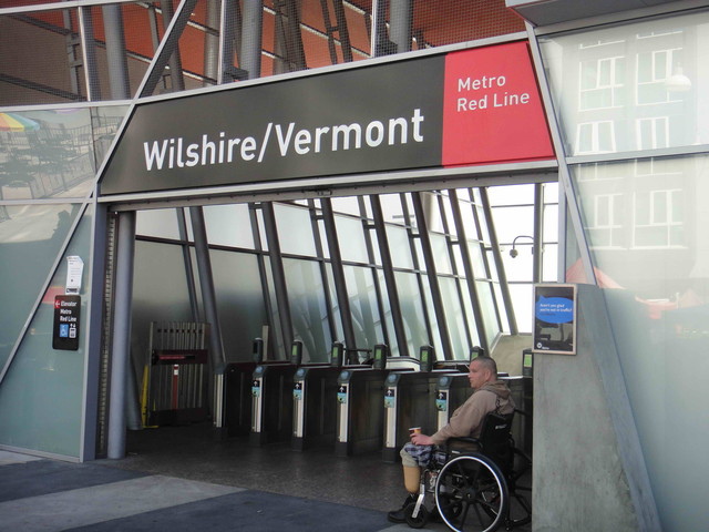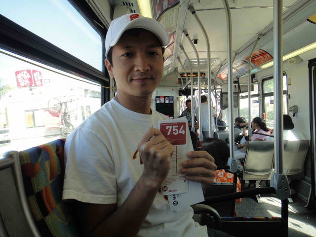 我們搭乘的公車是兩節式的,可以容納很多乘客。先從學校附近的 Exposition Park 坐到 Wilshire/Vermont 站,然後改搭地鐵前往 Hollywood 大道。這邊的地鐵站很老舊,月台很寬廣,最妙的是出口和入口都沒有服務人員,也沒有檢查機制,只有海報警告說沒有購票入站要罰 250 元。