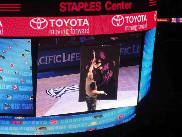 中場休息時有請一位藝術家當場以水彩繪畫,紀念逝世的 UCLA 知名教練 John Wooden