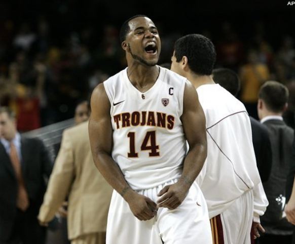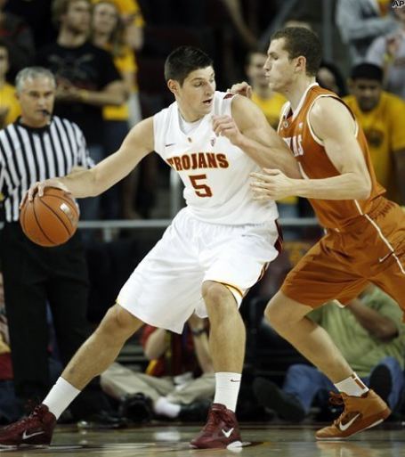 順便介紹一下隊上的幾位主力球員,第一位就是入選 PAC-10 first team 的 Nikola Vucevic,也是禁區門神之一。No.5,6-10,forward,junior。季賽平均成績是 double-double,17.3 分外加 10.2 籃板,不但是隊上的得分王和籃板王,三分線也有 35.4% 的命中率。左右手都有練出 45 度勾射,籃框附近的出手相當有把握,通常也都是對方重兵防守的目標,但是仍然在 Pac-10 以 21 次double-double 領先群雄。 (註:Vucevic 放棄大四球季投入 2011 年 NBA 選秀,於第一輪第 16 順位被七六人隊選走)