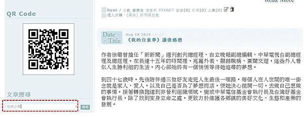 3) 到痞客邦的「Ryan / 小凱的部落格」,視窗往下拉在左側可看到「文章搜尋」,打入書名或關鍵字。