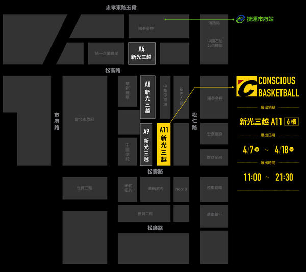新光三越主打的是「運動休閒生活展」,包括多款品牌商品特賣、歐美運動收藏展售會和 Conscious 籃球藝術展,由於是跟百貨業者合作,並沒有專屬和隔離的展覽空間。到了台北信義新天地 A11 館,搭乘電扶梯到 6 樓,會先在電視牆看到這個宣傳畫面,千萬不要以為走錯地方了。