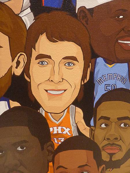 光光的作品時常被 NBA 球員分享,甚至主動要求合作。第一位私訊給他的球員是勇士隊的 Harrison Barnes,最大咖的球星則是國王隊的 DeMarcus Cousins,包括聖誕節的紀念 T-shirt,以及母校肯德基大學的慈善表演賽海報。如果我是 NBA 某一隊的 B 咖甚至 C 咖球員,在美國藝術家全都拿大牌球星當創作對象時,遠在台灣的某位畫家願意幫我畫張圖,當然會感激地痛哭流涕,馬上分享給我的家人和朋友們!
