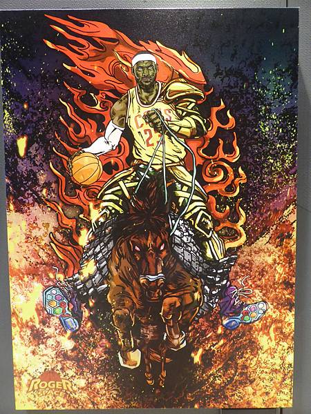 不動明王右手持的智慧之劍,在LeBron手上化作籃球,能切斷煩惱之根,左手所提繩索,是用來捆綁一切惡魔,而最大的惡魔,是自我內在的魔,此魔應為「磨」,執著自我之「磨」,所有外在的障礙、痛苦是來自於內在的自我執著,只要降伏了內心,則外在的一切將得到改變。「不動」意指初心不變,無物可以撼動其追求榮耀之心,這就是「王」,能主宰球場勝負及內心執念的王者,LeBron James。(內容轉貼自 Roger Space 粉絲團)