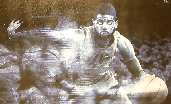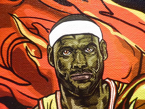 Lebron 的「僵屍化」程度比 Kobe 輕微,才剛變成殭屍不久,手臂肌肉還很壯碩,球衣仍然完整,手上的籃球不知道是哪一部分的人體器官。