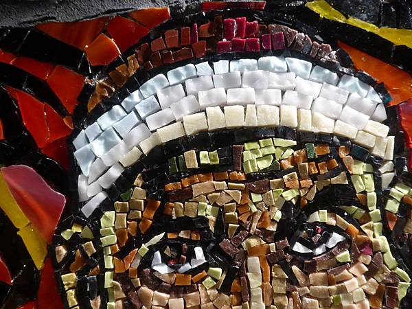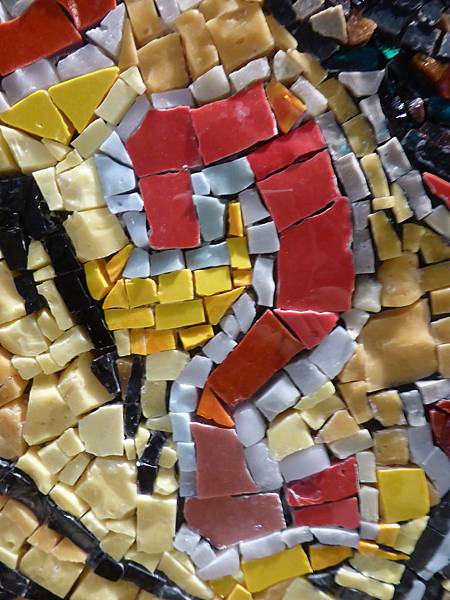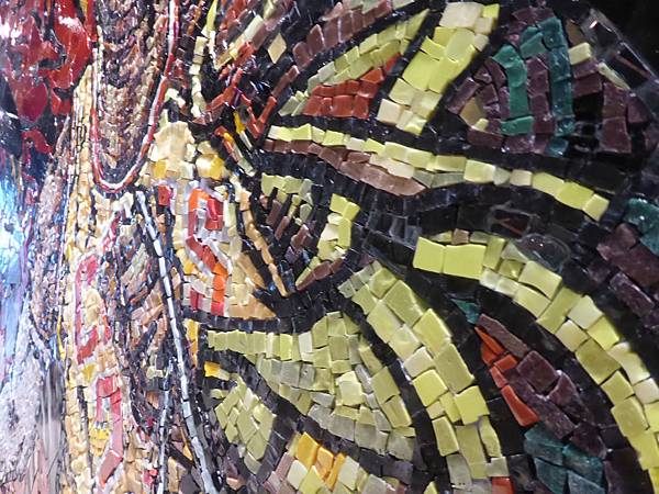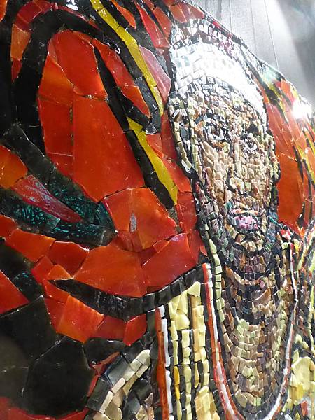 以馬賽克鑲嵌技法完成的《不動明王》,五顏六色的塊狀物叫做「琺瑯玻璃」,義大利文是 smalti,是歐洲專門用來做馬賽克鑲嵌的材料,Roger 特地從威尼斯進口回來。