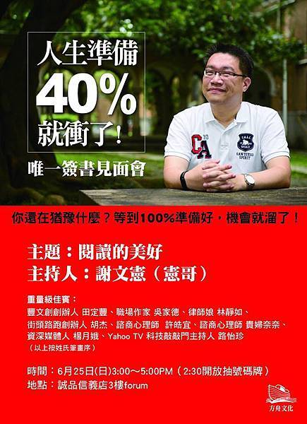 憲哥說兩小時的演講就有上萬元的收入,可是為什麼還要出書呢?因為可以看到很多聽眾,和大家分享自己的故事。另外,他的人緣非常好,無論是其他講者來站台,或是特別來賓來捧場,背後的原因就是他會主動幫助朋友,站在別人的立場思考需要什麼幫忙。此外,胡杰買了四十本的《人生準備40%就衝了》,送給四十位最重要的朋友,他更鼓勵讀者今天來聽簽書會,可以認識幾位新朋友。