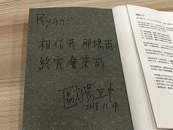 與其說歐陽老師盼到夢想的那場雨,不如說他努力讓自己追上會下雨的那朵雲。我非常謝謝他的祝福,聽完演講,更深深地體會到成功和爸媽取的「名字」無關,和別人的「祝福」無關,只和「相信」和「毅力」有關,你相不「相信」自己做得到,你有沒有「毅力」做到讓人看見的那一天為止。有歐陽老師這麼勵志的例子在眼前,就算當了爸爸的時間再少,也一定要繼續寫下去!