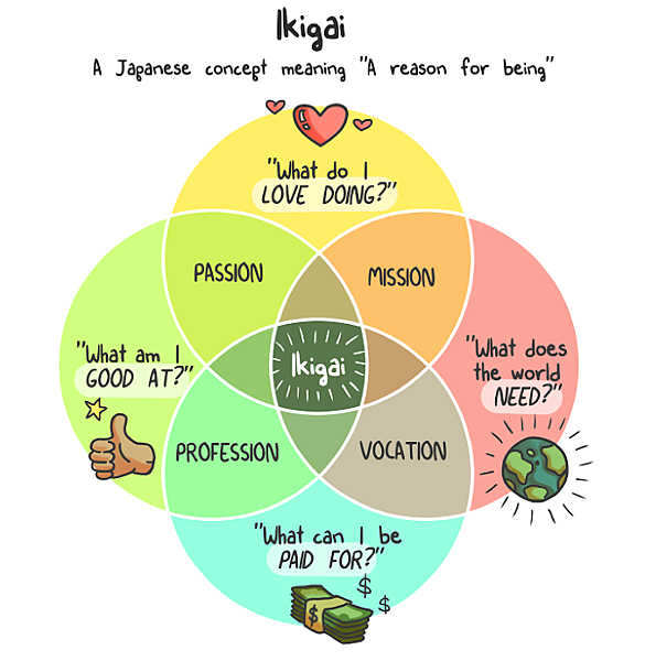 當初我買《IKIGAI:The Japanese Secret to a Long and Happy Life》這本書,是對 Ikigai 感到好奇,沒想到僅有一張圖,沒有多加解釋。自己上網查資料之後,覺得說明最詳細的是這個網頁: