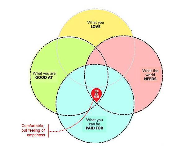 3. 如果「你擅長的事」和「別人會付錢給你的事」和「世界需要的事」是相同的,但不是「你喜歡的事」,你的日子會過得很舒服,卻覺得內心很空虛。