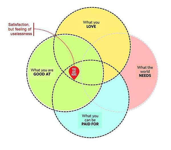 2. 如果「你喜歡的事」和「你擅長的事」和「別人會付錢給你的事」是相同的,但並非「世界需要的事」,你會感到很滿意,卻覺得似乎有點沒用。