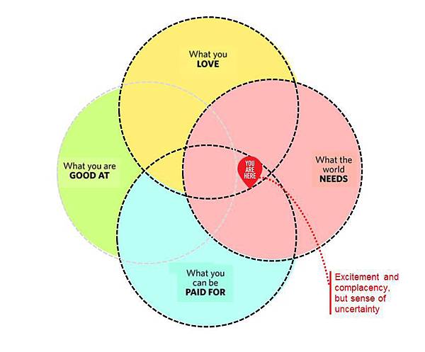 1. 如果「你喜歡的事」和「你擅長的事」和「世界需要的事」是相同的,但不等於「別人會付錢給你的事」,你會感到很高興和滿足,可惜沒有收入。